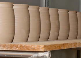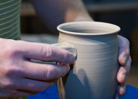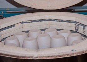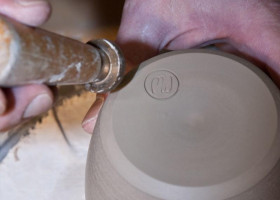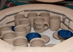 Vor dem Töpfern bereiten wir den Ton gründlich vor. Er soll weder zu weich noch zu trocken sein – hat er die richtige Konsistenz wird er von uns auf der Töpferscheibe geformt. Wenn der Scherben leicht angetrocknet ist (in der Keramik als „lederhart“ beschrieben), bearbeiten wir ihn weiter. Dann bringen wir den Henkel am Gefäß an. Danach muss der Formling ganz trocknen, bevor wir ihn in einem unserer Brennöfen bei ca. 900°C brennen (der sogenannte Rohbrand).