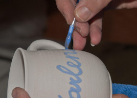 Wir haben auch weitere Dekormöglichkeiten zusätzlich zu der Möglichkeit die Tassen bunt einfarbig zu glasieren: wir bemalen unsere Namenstassen beispielsweise nach dem Rohbrand mit Unterglasurfarben  und glasieren sie mit transparenter Glasur. Zudem bieten wir bei Großaufträgen auch an, Logos im Siebdruckverfahren mit Aufglasurfarben drucken zu lassen und Keramiken mit Ihrem Logo anzufertigen.